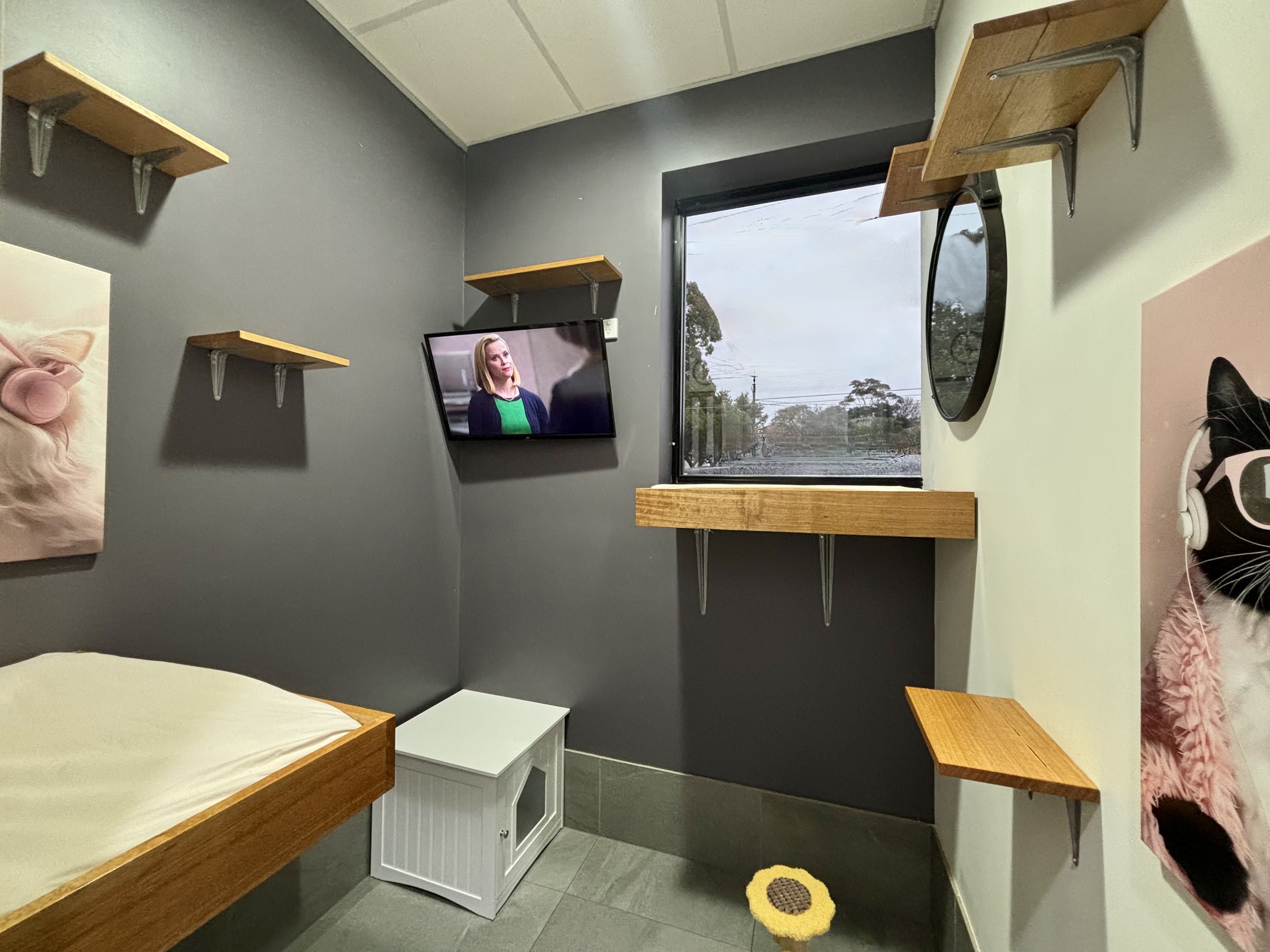 At Hotel For Cats, each suite is a masterpiece crafted with your cat’s comfort in mind. We offer human-sized rooms complete with climbing shelves and expansive windows for lounging and bird-watching. Whether it’s the Clowder Penthouse or the Safari Lodge, each space is a delight for your furry explorer.