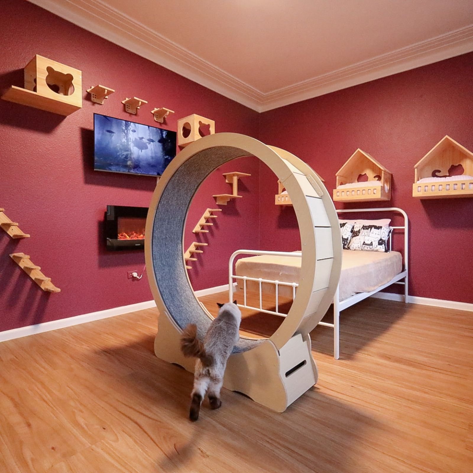 What’s a Clowder? Well, it’s a collective noun for a family of cats. The Clowder is crafted for adventurous felines or those who want to feel right at home. This suite is the largest in our hotel, with climbing furniture, spacious interiors and giant windows offering a view of the church or the north facing gym. The Penthouse Suites were originally a four bedroom human apartment whose bedrooms have been renovated just for puddycats. There are only four suites in The Penthouse. The rest of the apartment is used for our staff breaks and meetings, so lots of humans around for cuddles. Ideal for clowders (families) or those seeking oodles of space on holiday and the feeling they are at home. This may well be the largest individual cat hotel suites in the world.
