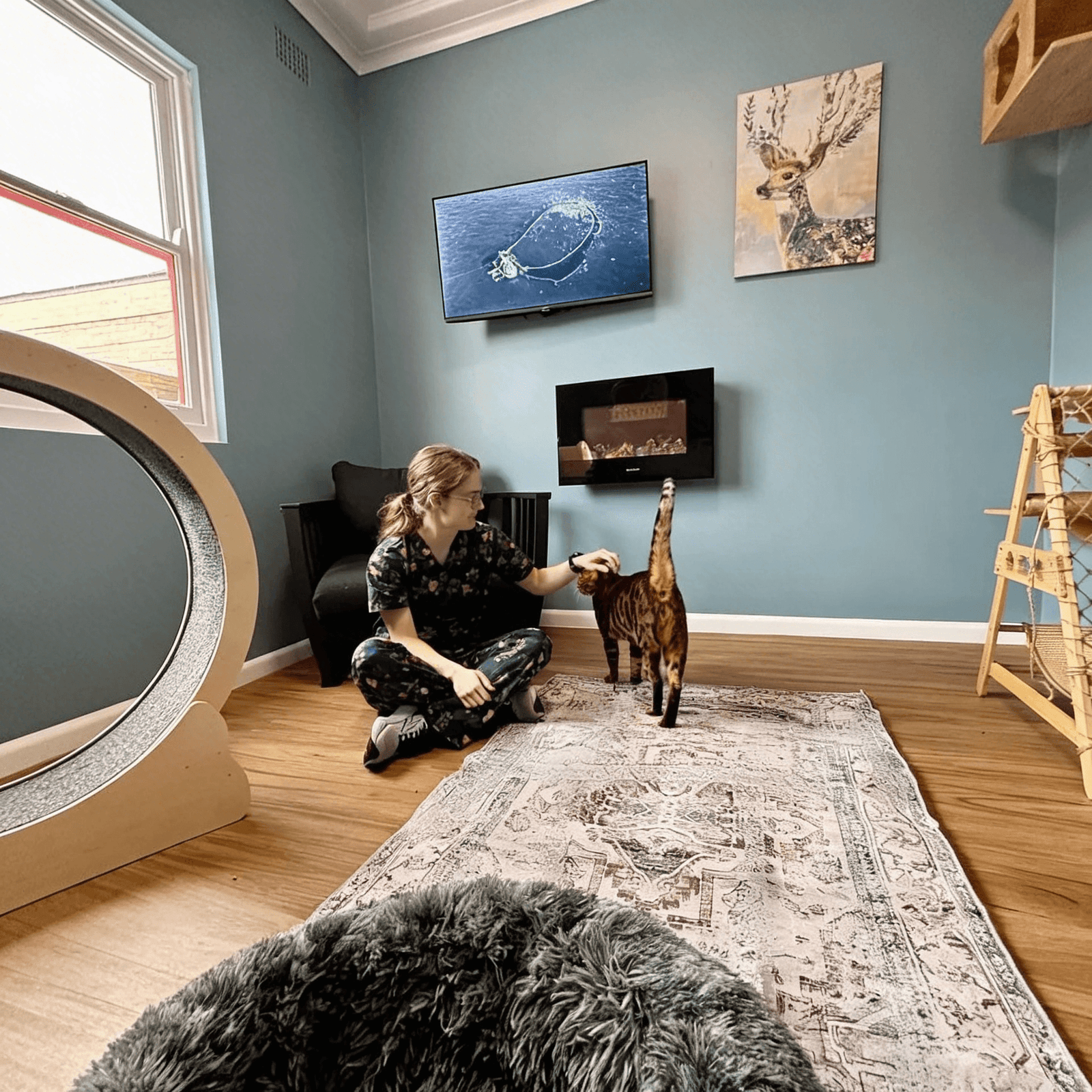 The Terrace Penthouse is the ultimate retreat for cats who enjoy spacious, engaging, and playful environments. Designed with feline comfort and adventure in mind, this luxurious space features an array of cute climbing furniture, providing endless opportunities for exploration and exercise. The massive room is bathed in natural light from large windows, offering the perfect spot for sunbathing and bird-watching. A high-energy cat will love the built-in cat wheel, perfect for zooming to their heart’s content, while the secure window catio offers a taste of the outdoors in a safe and stimulating setting. Whether your feline friend loves to frolic, climb, or lounge in the sun, the Terrace Penthouse provides the perfect blend of fun, freedom, and relaxation.