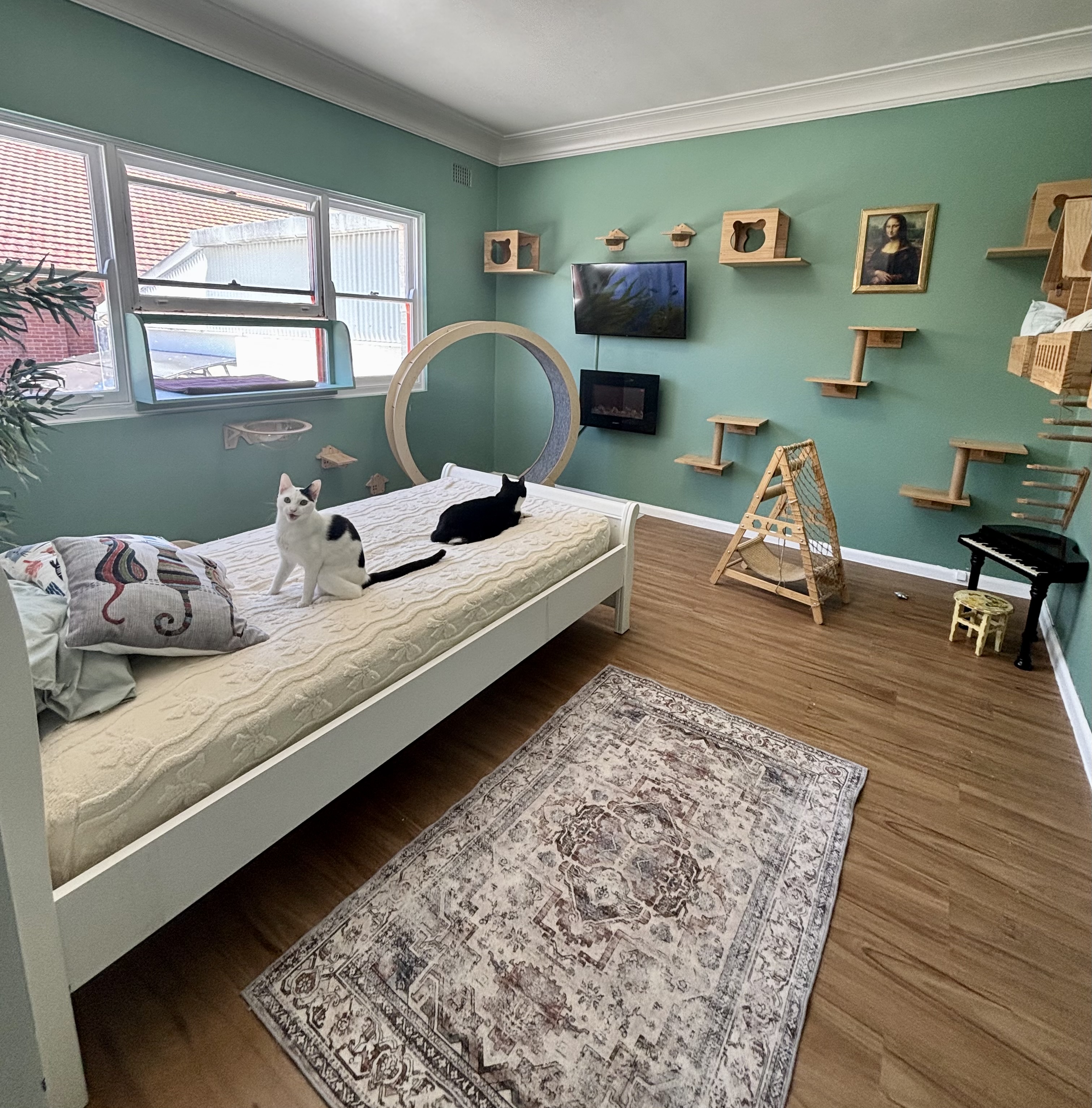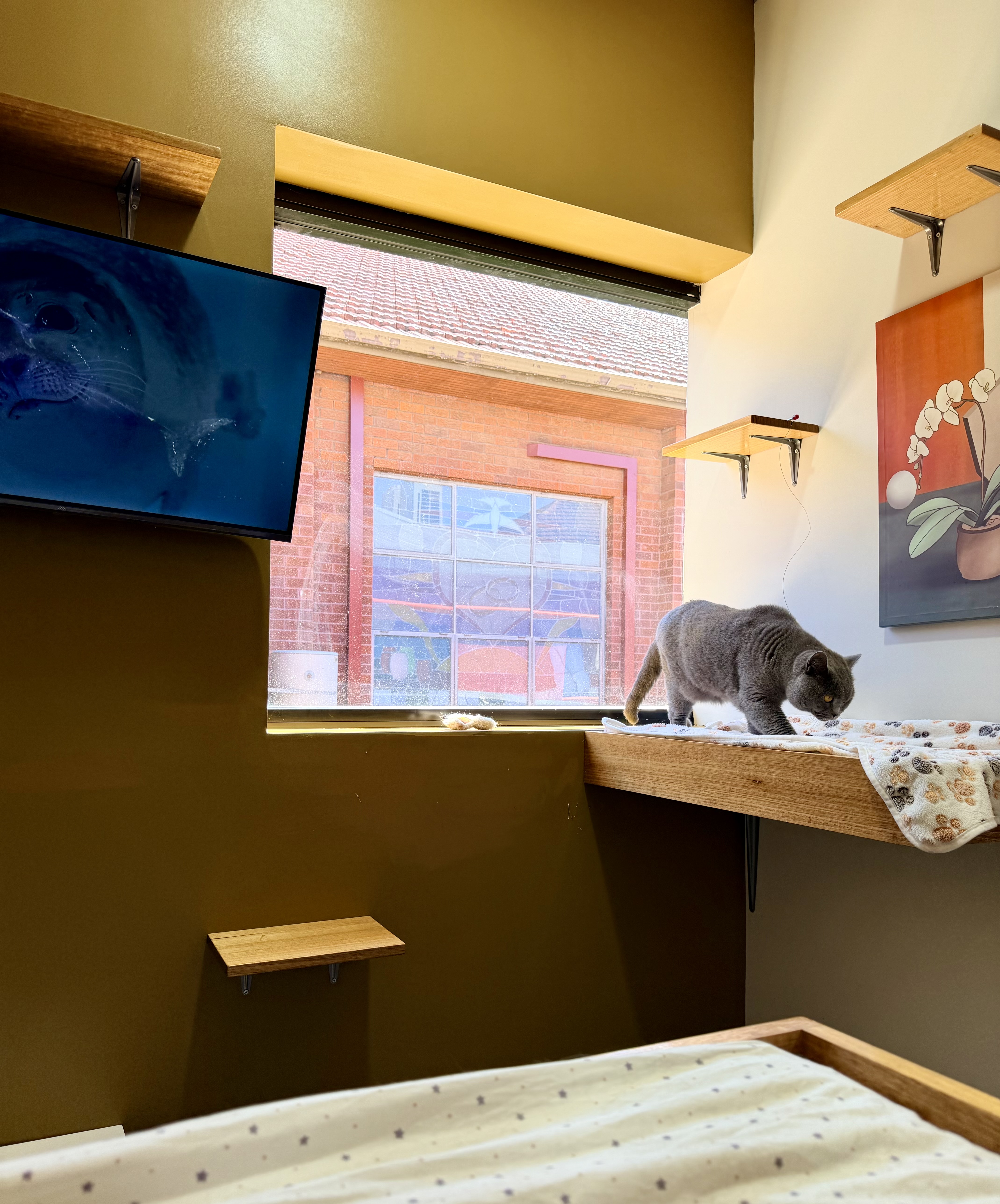 Step into any of our rooms, and you’ll find more than just space. Our human-sized suites allow your cat to stretch, roam, and explore freely. With expansive windows, your feline can bask in the sun or indulge in bird-watching from their private perch. These aren’t just rooms; they’re personal retreats for every guest. And here’s the kicker: most people think cats need just a small space, but our guests enjoy roaming in 4.5m² of pure feline wonderland.