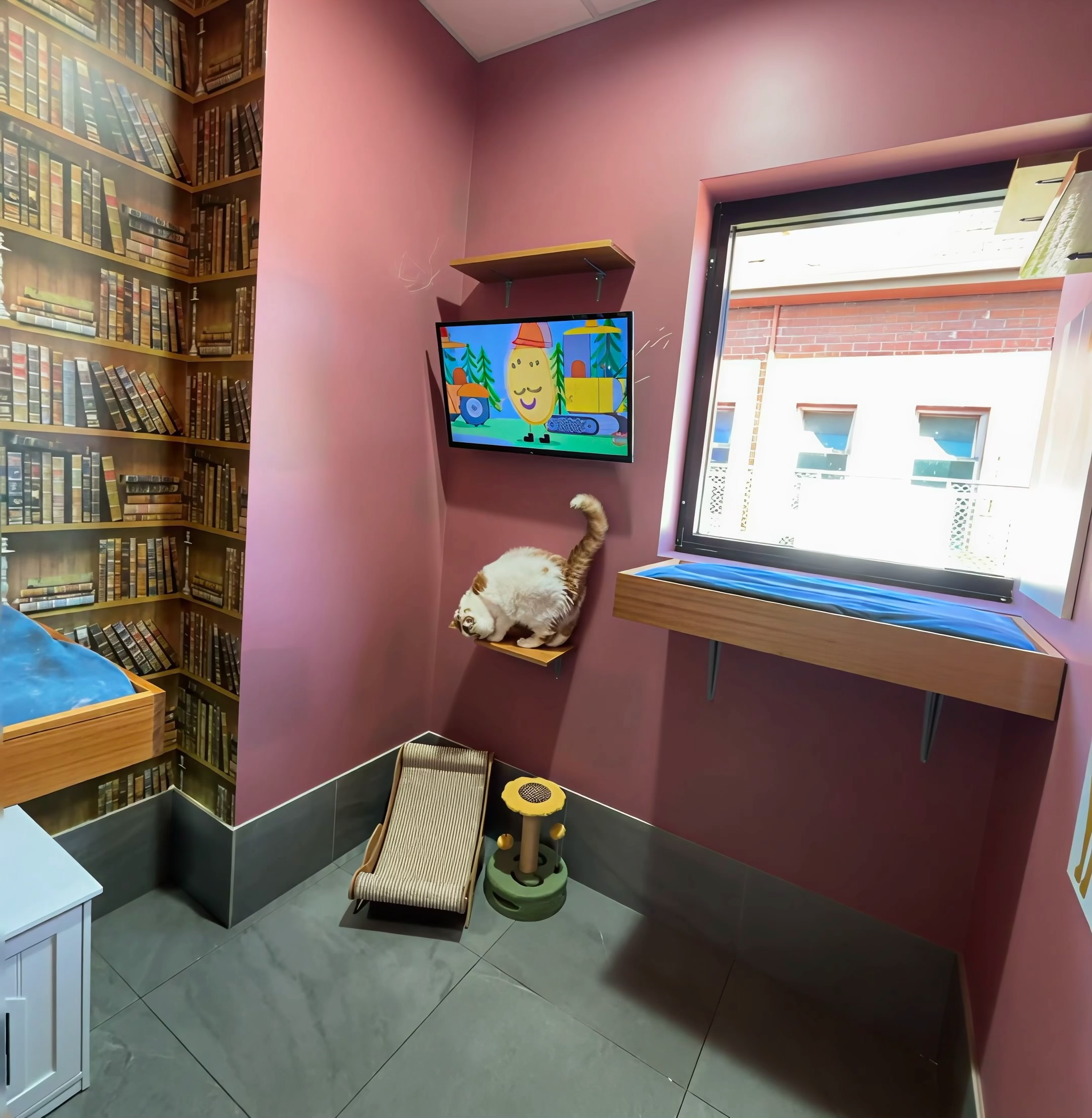 Our suites are designed with your cat’s comfort in mind. Think of them as designer dens, complete with climbing shelves, big windows, and plush bedding. It’s a home away from home, crafted to make your cat feel pampered.
