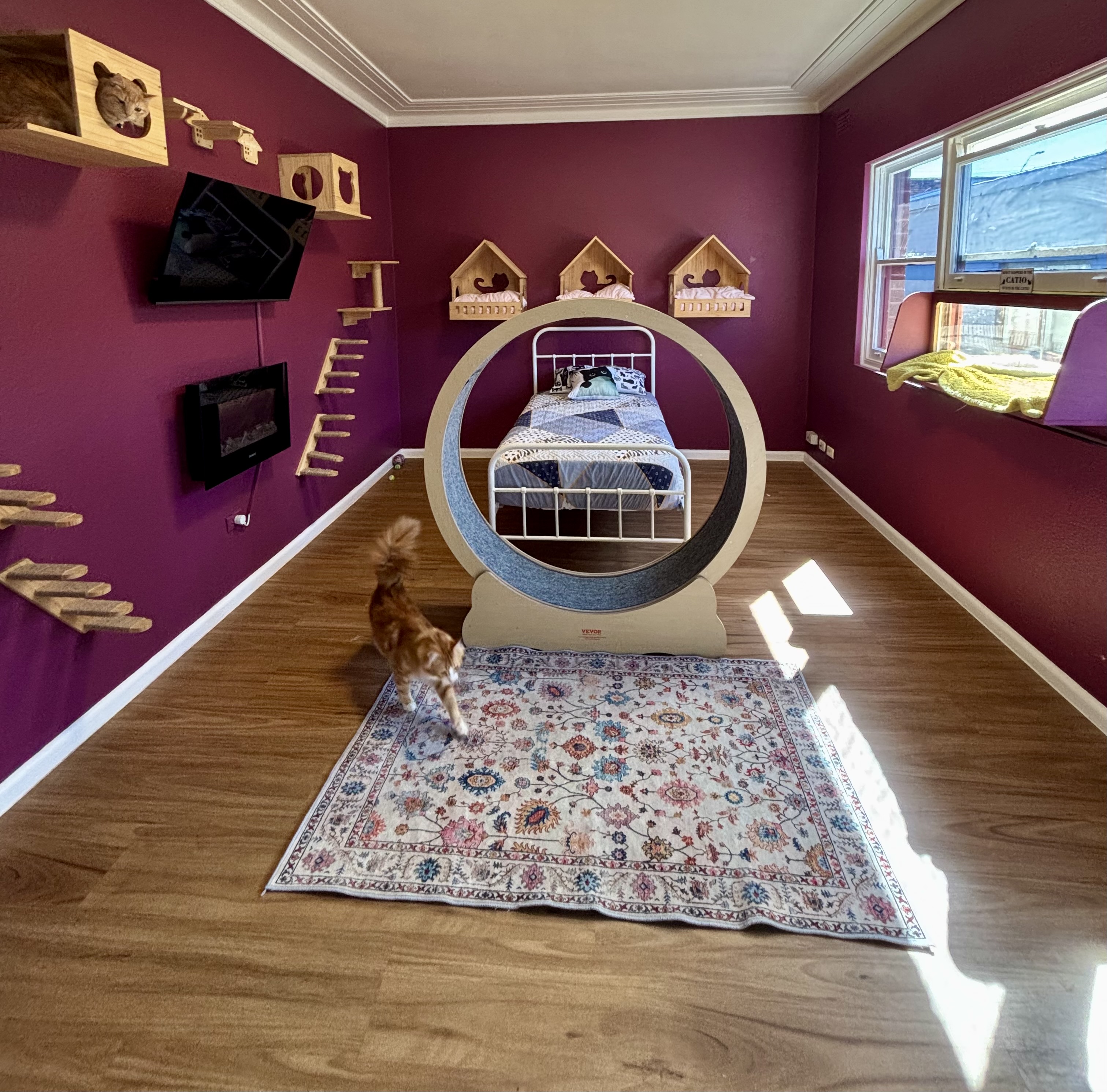 Our guests love the extensive climbing spaces and exercise wheels, perfect for burning off energy. Plus, with TVs in each suite, your cat can enjoy their favourite shows. This blend of activity and relaxation ensures a balanced day for your feline friend.