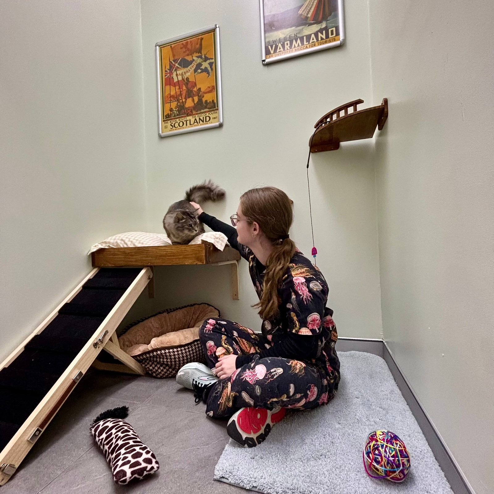 Our suites aren’t just rooms—they’re retreats that promise relaxation and fun. Cats can explore their surroundings or rest in a peaceful corner. The choice is theirs. Learn more about the importance of enrichment for boarding cats. We offer daily play sessions tailored to your pet’s preferences, ensuring they’re always engaged and content.